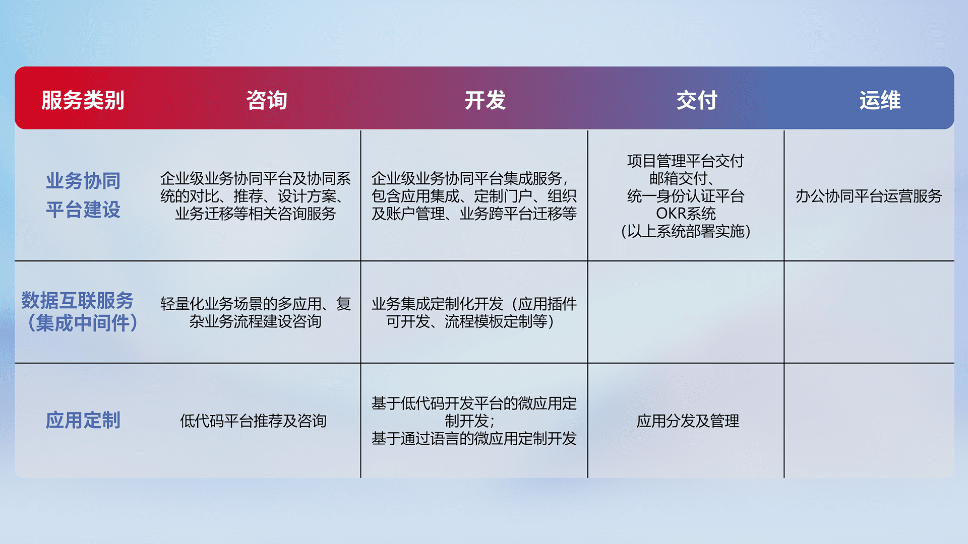 针对钉钉、、、企微、、IDaas等平台级产品提供产品的规划、、、、方案、、、、交付、、定制化开发等服务,,实现如统一协同办公、、、智能客户服务、、、、混合会议管理、、、智能数据查询、、等业务场景,,,,实现数字化转型。。。。