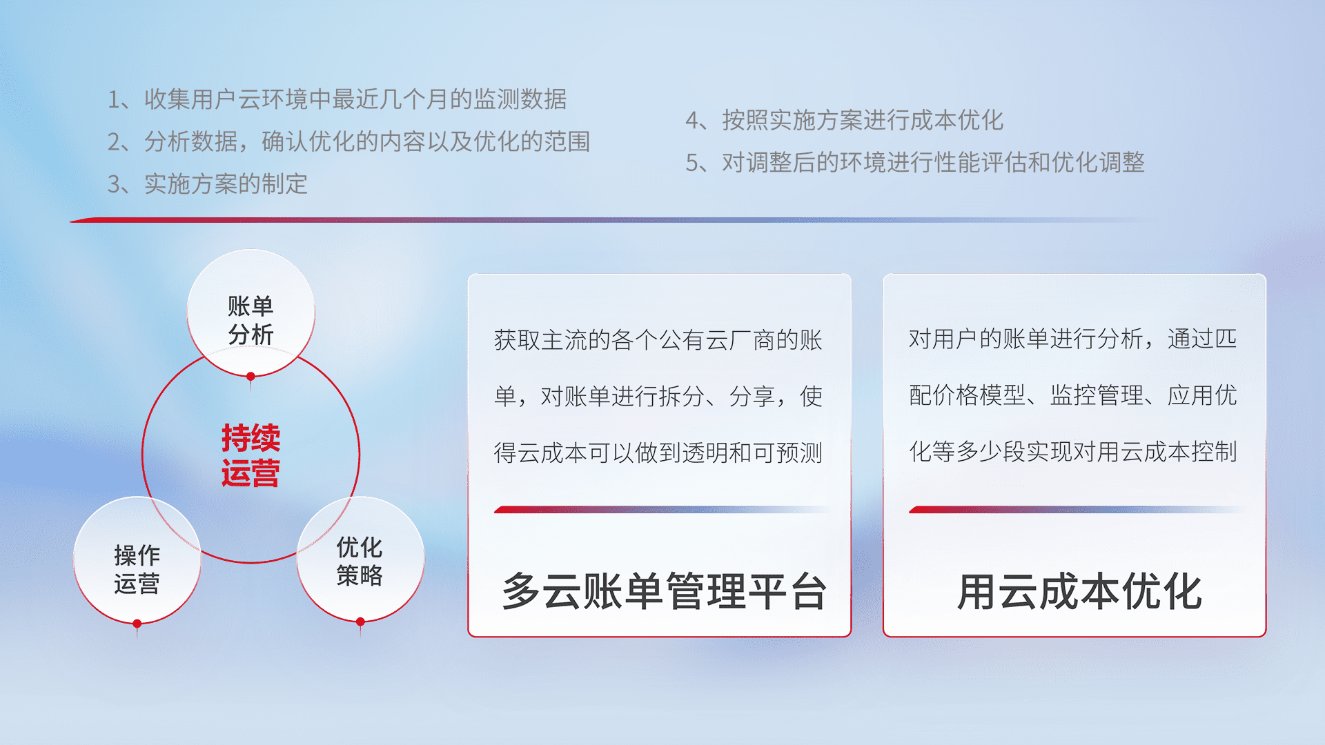 通过灵活运用多种自动化迁移工具,,,帮助企业用户实现业务和数据高效 、、、稳定的上云迁移和云上迁移,,,,采用自研多云纳管平台,,,,以中立管理模式,,,解决多组织、、、、多云、、、、多运维厂商的复杂关系的管理,,,,保证多云平台资源配置的一致性,,,,实时掌控云资源运行数据,,,运用智能化工具分析云资源多云平台的管理服务,,,透明化管理成本支出,,,用云成本可预测、、用云费用可优化、、云资源配额有据可依。。