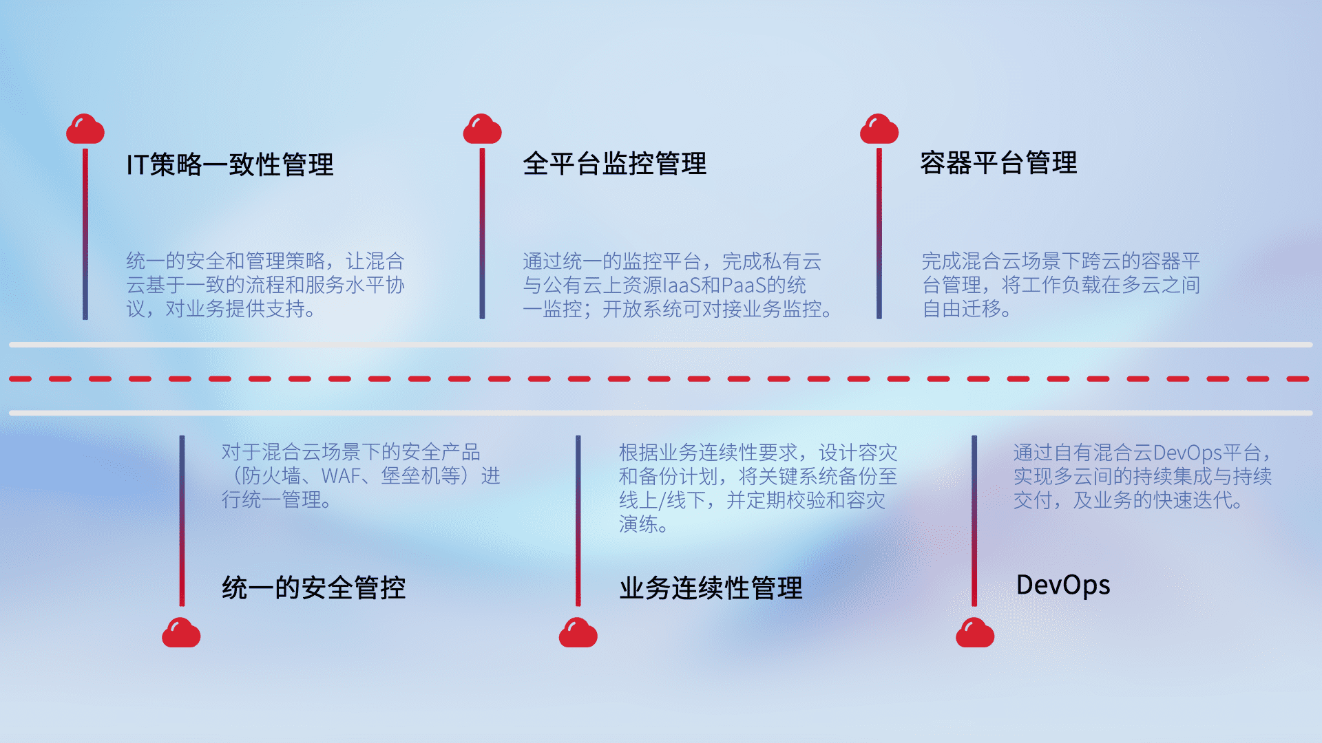 通过多云纳管,,以统一的资源数据模型把客户的云资源进行抽象和封装,,,进而实现对多云资源的统一操作,,,,保障云资源管理的可靠性、、稳定性与可用性。。量身定制化运维内容,,,配置、、开发运维、、、、补丁管理、、备份、、监控、、、、认证和访问管理、、、、审计和日常巡检等,,,,保障在用云过程中的可靠度,,,,稳定度以及高可用率。。